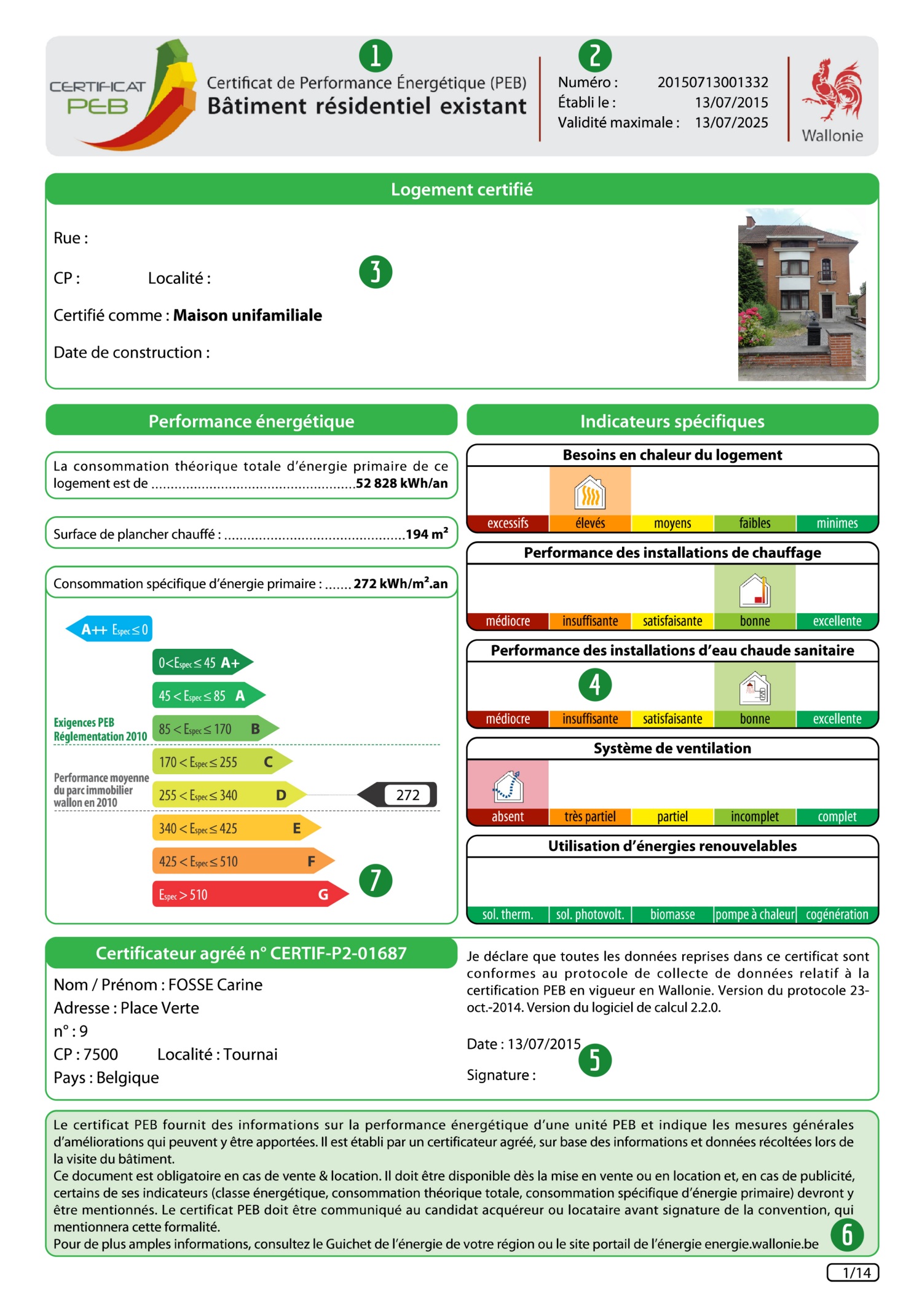 Le certificat est composé d'une quinzaine de pages (le nombre est variable suivant les particularités du logement). Le certificateur le signe et le transmet par courrier.